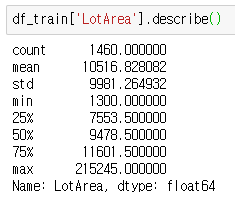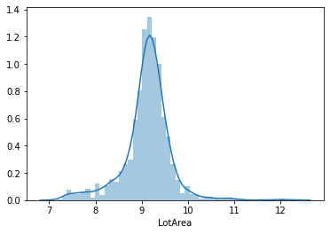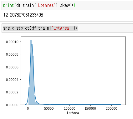 나는 이 데이터로 몇 가지 테스트를 해본 적이 있고 LotArea 컬럼이 충분히 높은 skew를 가지고 있다고 알고 있기 때문에 해당 변수만 확인하겠다.