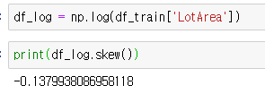 이후 로그를 취해 변환하고 skew를 확인하니 12.x 에서 -0.1x 정도로 0에 가까운 왜도(skewness)가 나온다.
