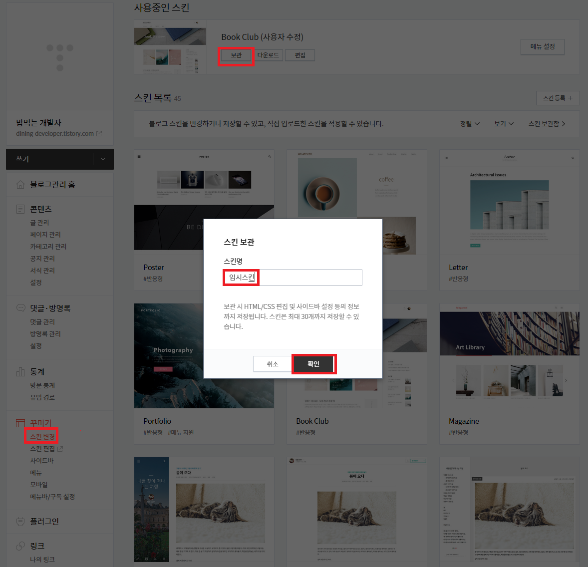 블로그 관리 - 꾸미기/스킨 변경 - 보관 -이름 입력 후 저장
