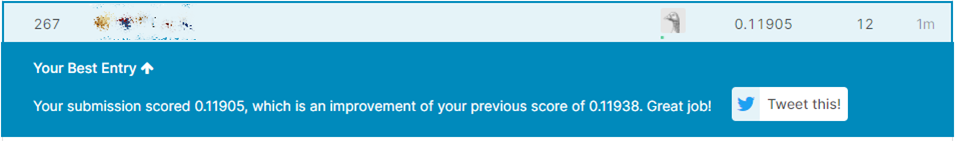 드디어 0.11xxx 초반에 진입을 했다. train set에서는 스태킹이 기존 알고리즘보다는 더 좋은 성능을 보여준다. 오버 피팅인지 아닌지는 더 살펴봐야겠지만..