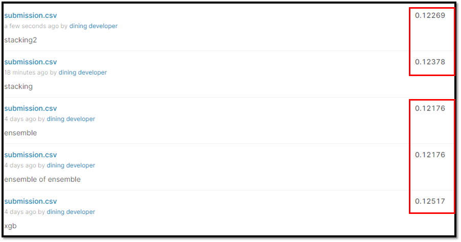 드디어 0.11xxx 초반에 진입을 했다. train set에서는 스태킹이 기존 알고리즘보다는 더 좋은 성능을 보여준다. 오버 피팅인지 아닌지는 더 살펴봐야겠지만..