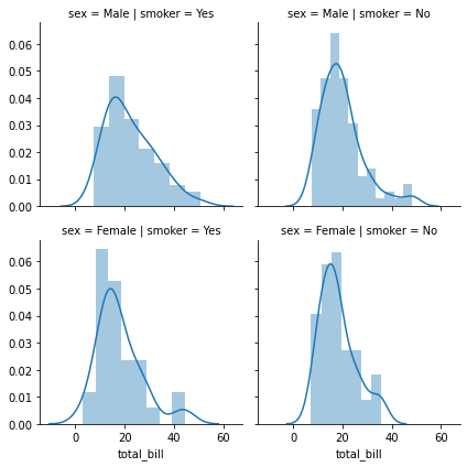 sns.FacetGrid(df, col = 'smoker', row = 'sex').map(sns.distplot, 'total_bill')