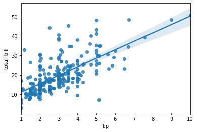 Regression plot은 지금까지 봐온 plot과는 개념이 조금 다른데, regression 머신러닝의 결과를 그래프에 표기해준다.