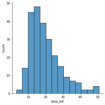 # == sns.displot(x=df['total_bill'], kind='hist')