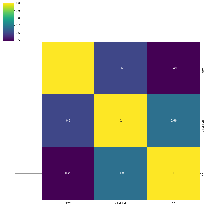 sns.clustermap(df.corr(), annot=True, cmap='viridis')