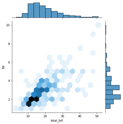 sns.jointplot(x=df['total_bill'], y=df['tip'], kind = 'hex')