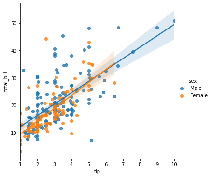 - hue에 들어간 컬럼의 값을 구분하여 따로따로 모델링하여 결과를 보여준다.