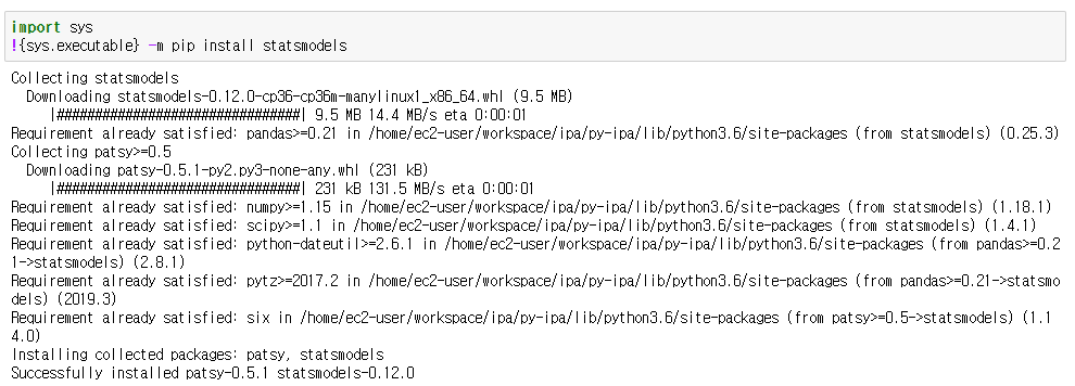 그럴 경우 jupyter에서 사용 중인 인터프리터와 쉘상에서 가리키고 있는 파이썬 인터프리터가 다르기 때문인데, 해당 인터프리터를 찾기 귀찮으니 jupyter 상에서 아래와 같이 입력해서 설치해주면 된다.