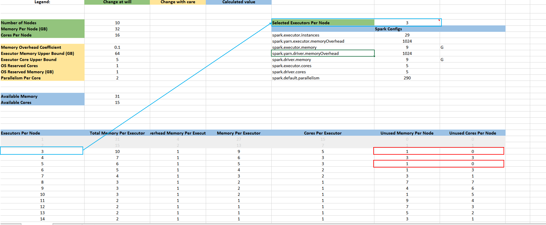2. 적당히 자원 분산이 잘되고, 미사용 메모리 미사용 코어가 없는 Excutors Per Node를 골라 우측 상단에 입력해준다.(파란색 박스)