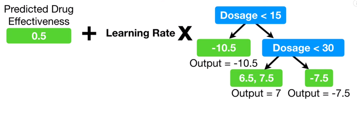 이후 각각의 예측값을 위의 식으로 변경한 트리를 완성한다. 학습률(Learning Rate)은 모델에 따라 다르게 지정하며 라이브러리에서는 eta로 표기된다.