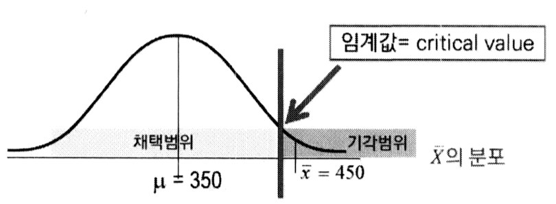 - 임계값을 초과하면 대립가설이 채택된다.(좌측검정일때는 임계값 미만일 때)