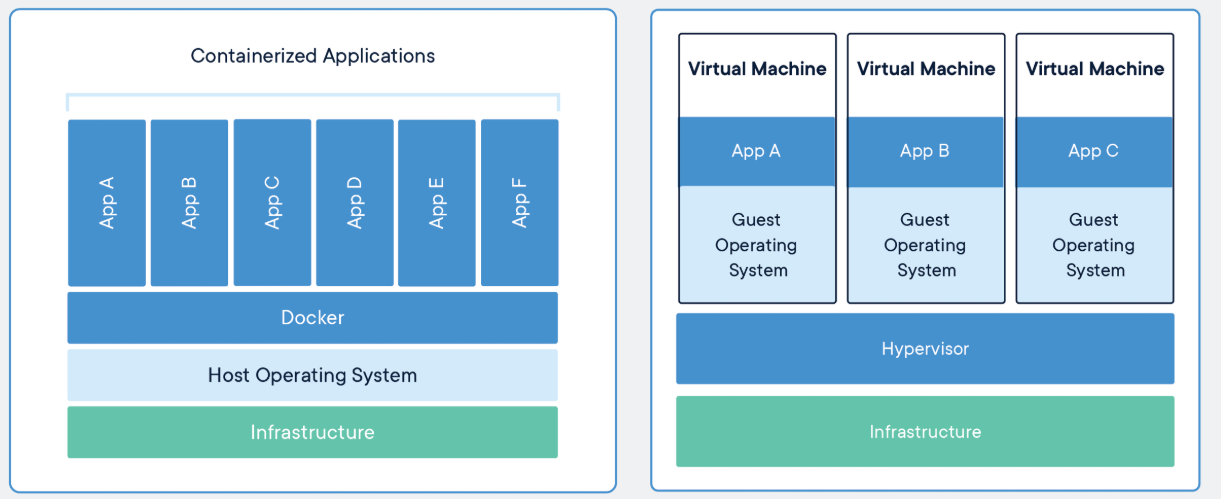물리적 하드웨어를 추상화하여 하나의 서버를 많은 서버로 전환하는 것이다. 하이퍼바이저를 통해 단일 시스템에서 여러 VM을 실행할 수 있음 각 VM에는 운영 체제, 어플리케이션, 필요한 이진 파일 및 라이브러리의 전체 복사본이 포함되며, 여기에는 수십 GB가 소요된다. VM의 부팅 속도도 느릴 수 있다.